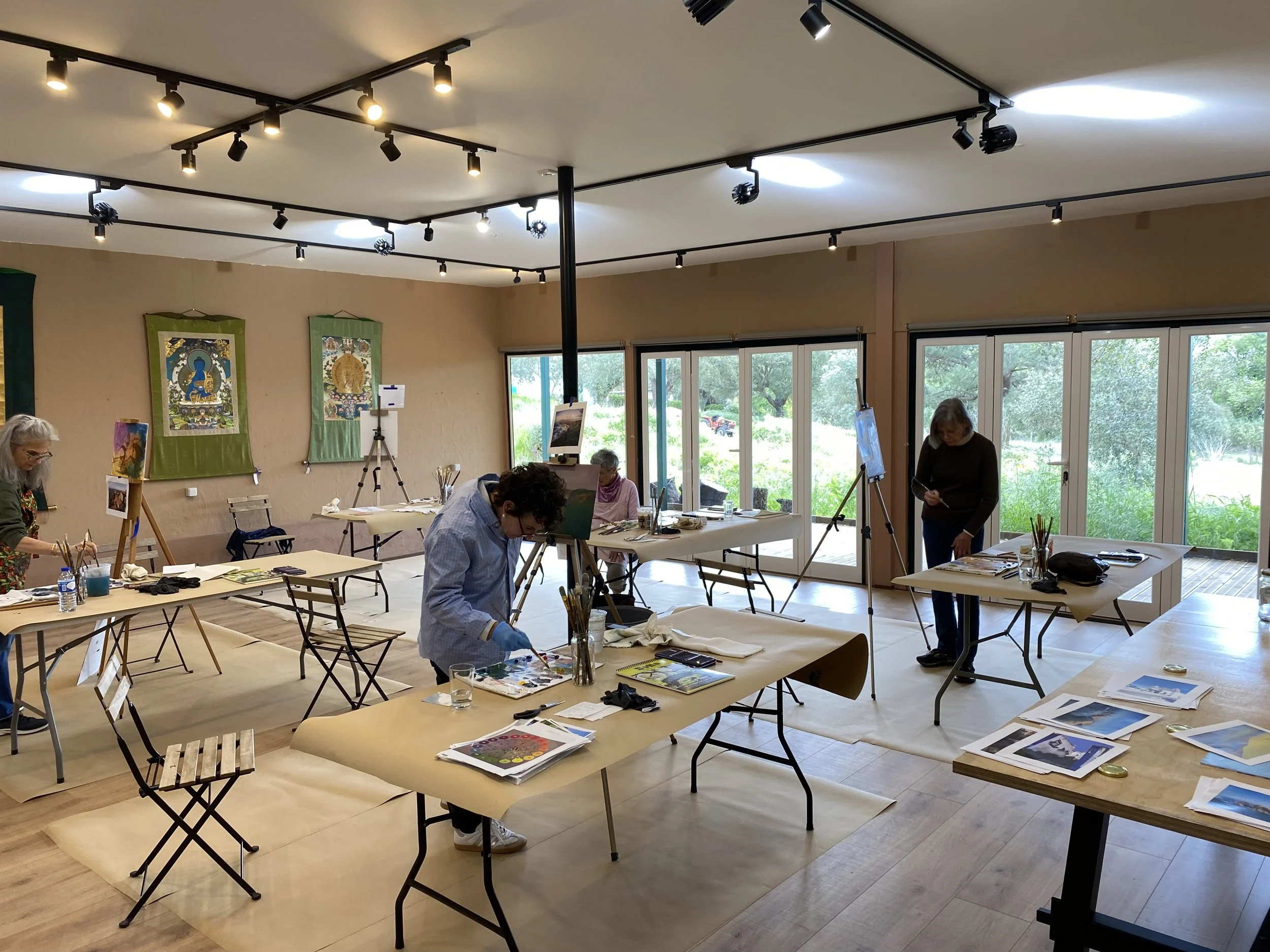 Our spacious studio is set in a modern building with a wall of glass doors facing the rustic landscape that surrounds the estate. Each painter has access to a full range of professional-grade acrylic paints, canvas panels, brushes, palettes, latex gloves, buckets, and their own easel, table, and chair. Since we mostly focus on landscape imagery, it’s helpful to have an iPad or another tablet for taking photographs of the area to use as source material for your paintings. I also provide photographs of the area for inspiration.